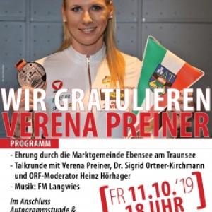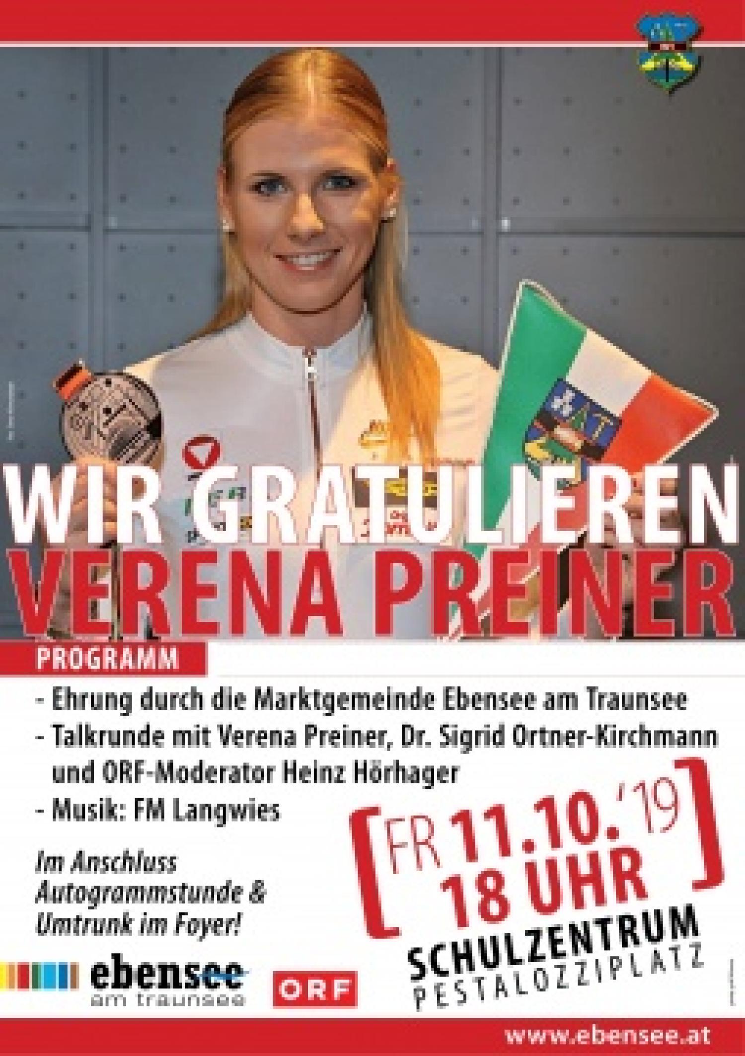 Freitagabend, ab 18 Uhr, wird im Schulzentrum am Pestalozziplatz in Ebensee gefeiert. Bürgermeister Markus Siller und die Union Ebensee laden zum Ehrenempfang von WM-Bronzemedaillengewinnerin Verena Preiner. Auch Klubkollegin Sigrid Ortner-Kirchmann, 1993 in Stuttgart WM-Dritte im Hochsprung, wird mit dabei sein. ORF-Moderator Heinz Hörhager führt durch den Abend, der mit einer Autogrammstunde der 24-Jährigen ausklingen wird.